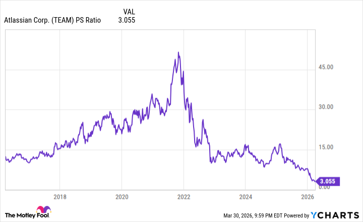 В 2021 году, в период технологического бума, коэффициент цена/продажи (P/S) акций Atlassian достиг 50 – абсолютно нереалистичная цифра. Но падение акций на 85% в сочетании с постоянным ростом доходов привело к тому, что P/S снизился до 3.1. Atlassian никогда не была настолько дешевой с момента выхода на биржу в 2015 году.
