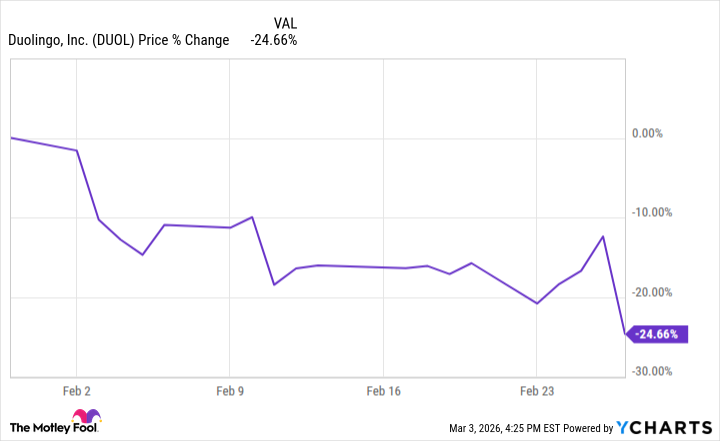 Акции Duolingo (DUOL +0.44%) в феврале пали, как осенние листья, и не столько от холода рынка, сколько от собственных, кажущихся, успехов. Ибо, как гласит старая истина, истинное величие заключается не в достижении вершин, а в умении сохранять достоинство при падении. Компания, разумеется, не оценила иронии.