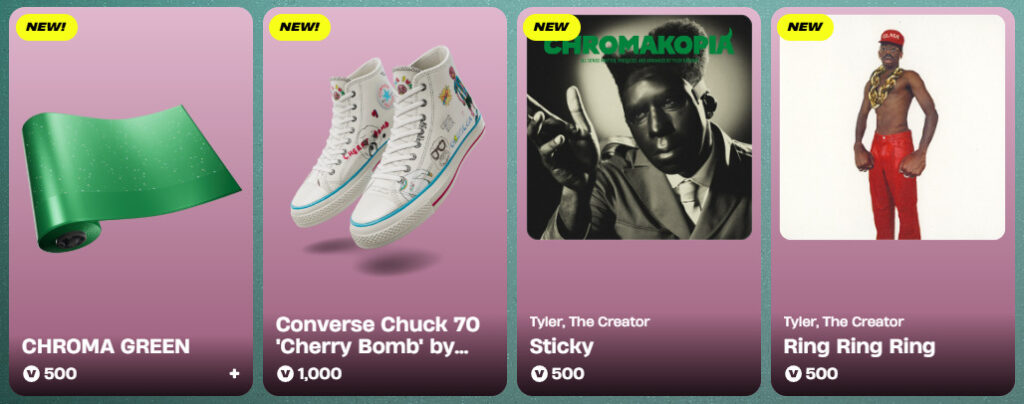 Fortnite также предлагает разнообразные косметические предметы, такие как обертки для персонажей, украшения для спины, эмоции и инструменты для использования в режиме Fortnite Festival. Вот полный список цен на все продукты в коллаборации Fortnite и Tyler, the Creator.