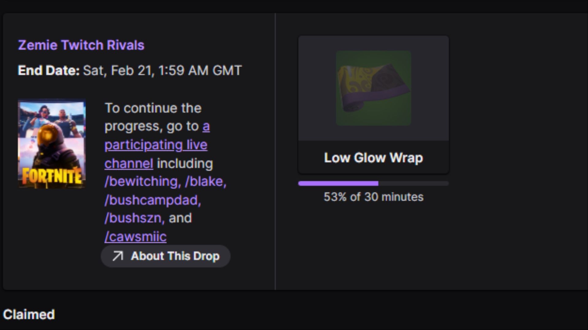 Fortnite предлагает бесплатную обёртку под названием Low Glow в рамках акции с Twitch Rivals. Вы можете получить её, посмотрев любой из участвующих каналов Twitch не менее 30 минут.