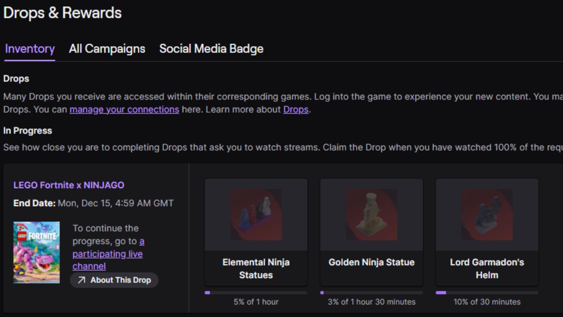 Мероприятие NINJAGO Fortnite Twitch Drops завершается 14 декабря в 23:59 по восточному времени. Чтобы получить эти бесплатные предметы в Fortnite, вам нужно посмотреть как минимум час и тридцать минут квалифицированных Twitch-трансляций до этой даты.