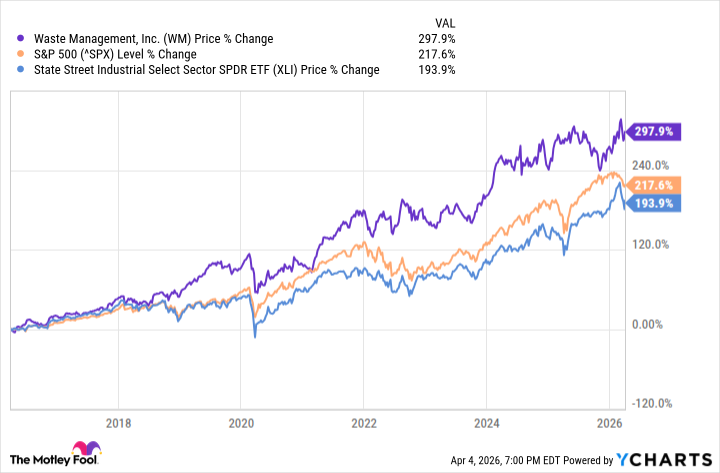Во-вторых, возможно, к удивлению некоторых, WM вполне можно отнести к «горячим» акциям, несмотря на то, что компания работает в, скажем так, не самой престижной отрасли. За последнее десятилетие это была одна из самых успешных промышленных компаний, опередив как свой сектор, так и индекс S&P 500. Удивительно, не правда ли? Как будто в куче мусора вдруг расцвел редкий цветок.
