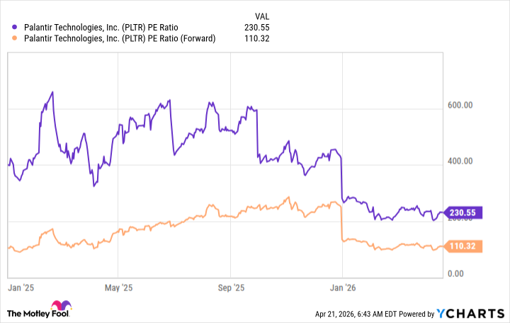 Главное, что я упустила из виду, – это оценка компании. И именно поэтому акции Palantir не взлетают, несмотря на хорошие результаты. Поскольку компания прибыльная, можно использовать коэффициент P/E. Это логично, правда?