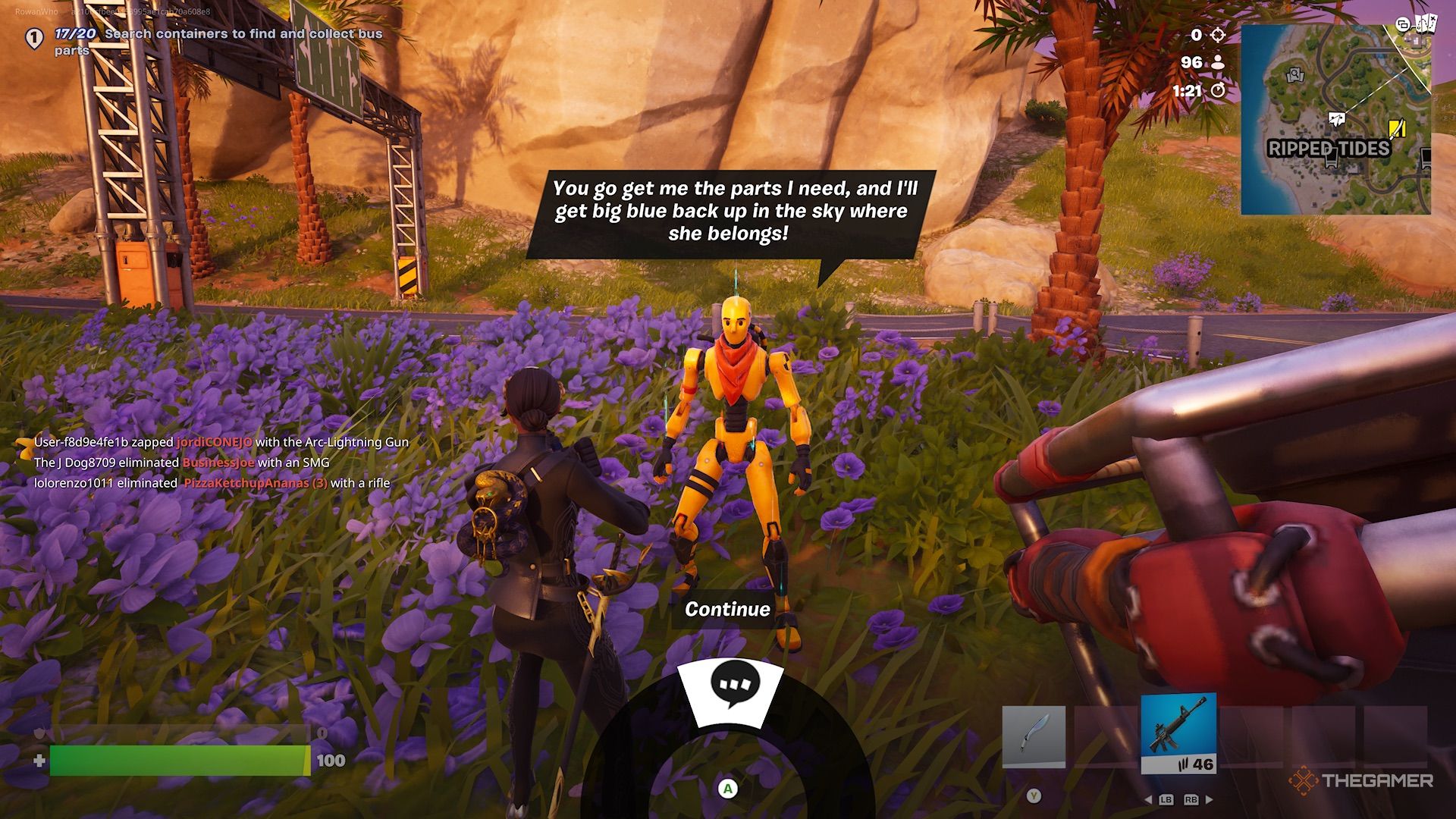 | Поговорите с Dummy о разрушении Battle Bus. | Дамми тусуется на Ripped Tides, рядом с очень поломанным Battle Bus. |